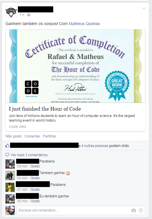 Este ano fiz questão de entregar os certificados do evento Hour of Code. É um papel, sabemos, mas um papel que surpreendeu pela importância que a maioria dos alunos lhe deram. É o meu primeiro certificado, ouvi. Vou emoldurar... mas mais que ouvir, vi o cuidado com que o guardavam entre os dossiers e livros escolares.