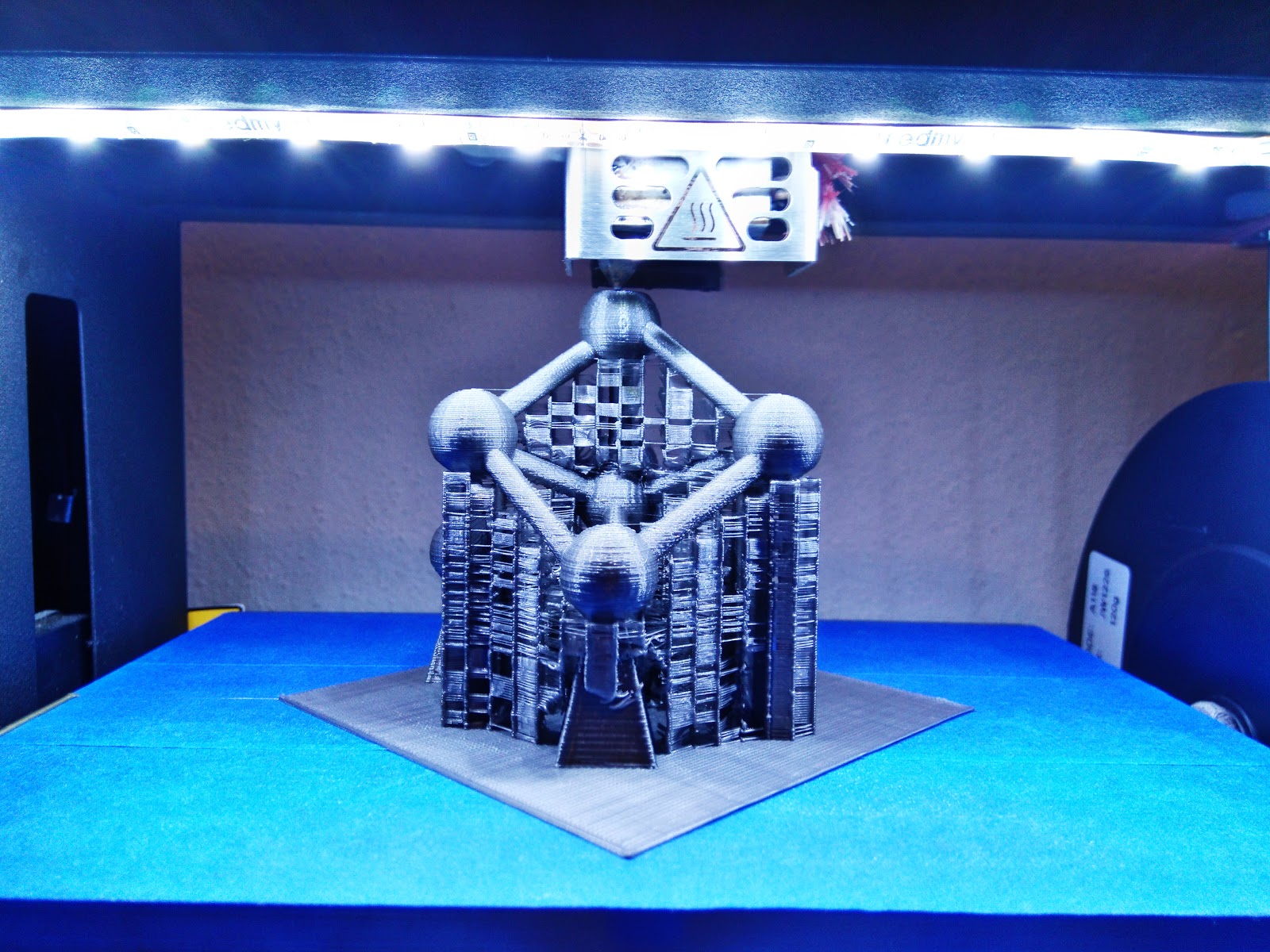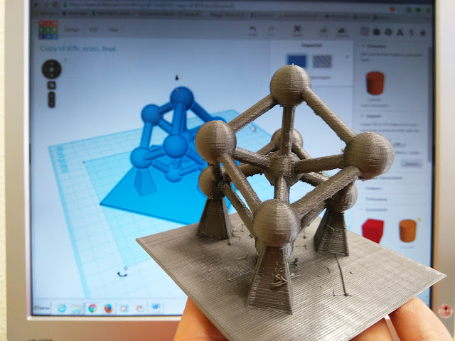 A última impressão da semana, um modelo do Atomium belga criado no Tinkercad por alunos do sétimo ano em TIC. Uma forma destas requereu imenso filamento gasto em suportes.