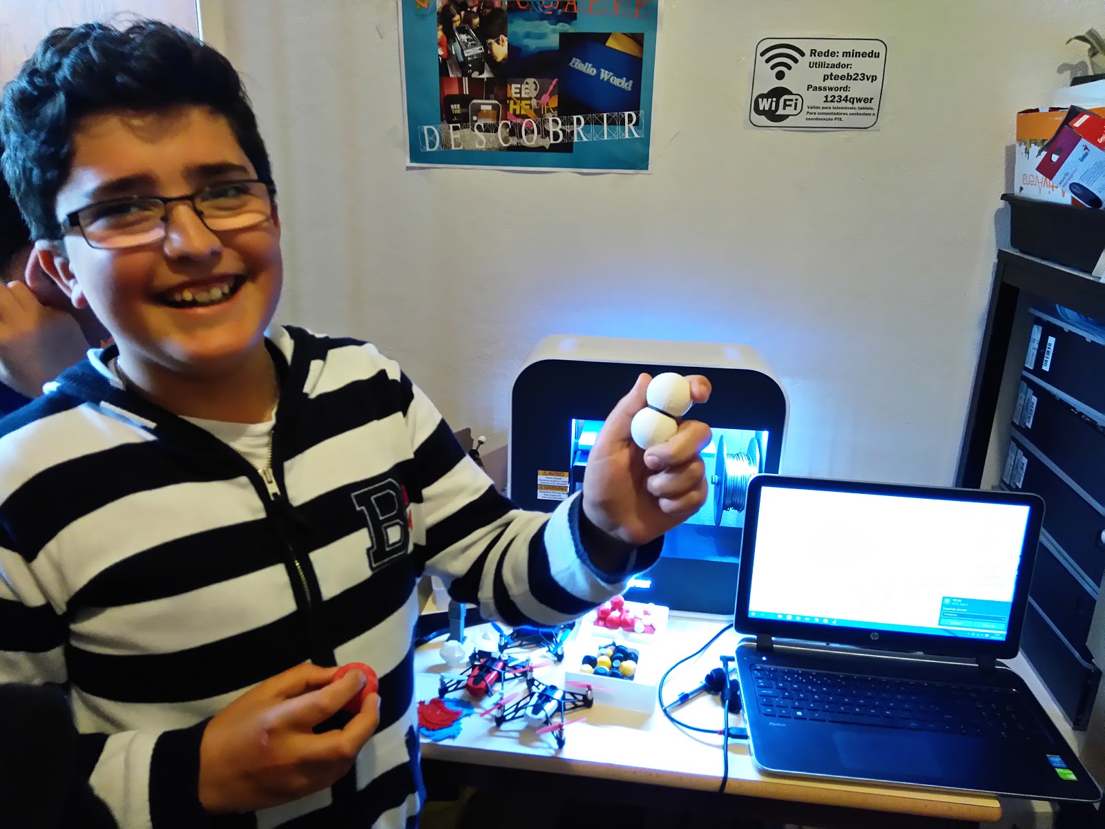Olhe, professor, fiz H2! E fez muito bem, é gás de hidrogénio. Ter a impressora numa sala de aula que não é exclusiva das TIC não nos é possível, mas a porta do gabinete de trabalho está sempre aberta. Se nos intervalos me esquecer de dar um salto à sala de professores para ir tomar um café... já sei que serei invadido por alunos curiosos, que querem saber o que é que se está a imprimir.