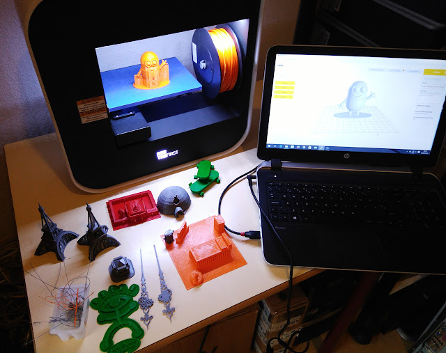 Os trabalhos dos alunos impressos em 3D em destaque. Thingmaker Design, Sketchup Make e Tinkercad foram as aplicações cujo potencial mostrámos.