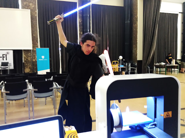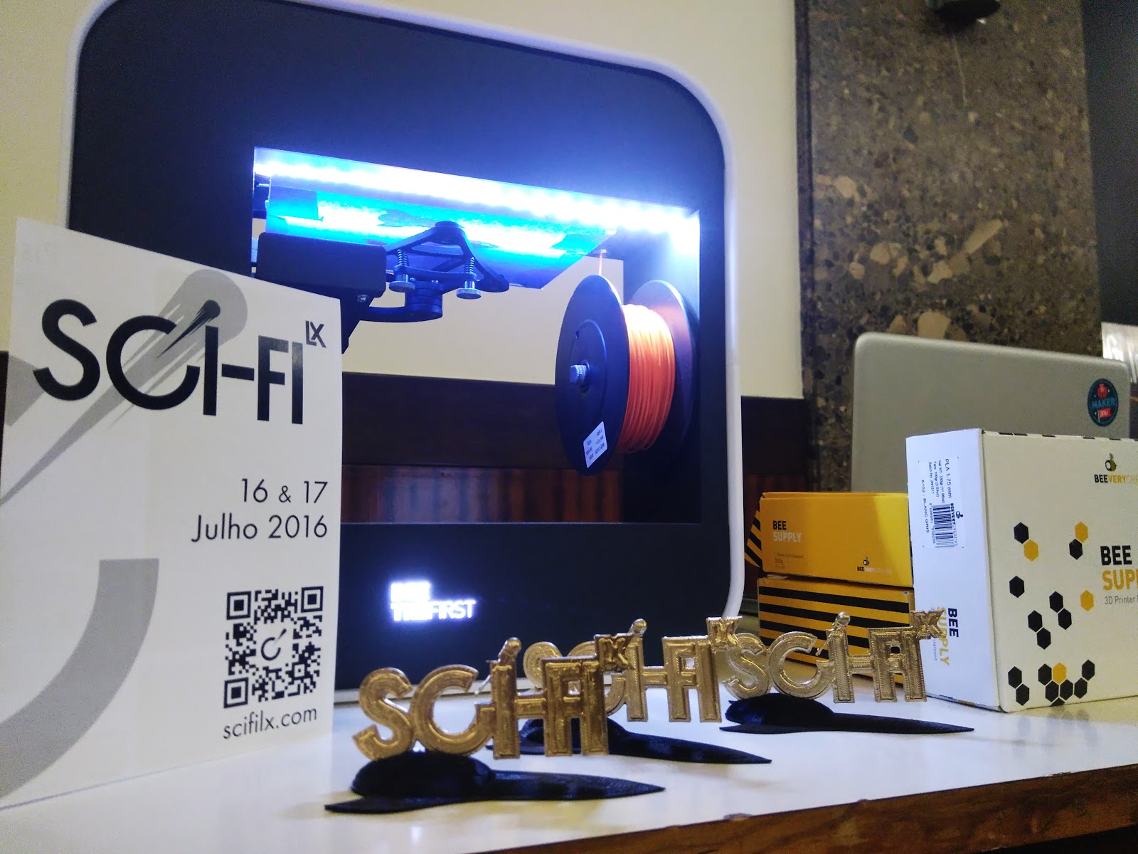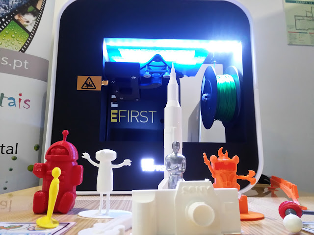 workshops, foi dinamizado um de introdução à impressão 3D, com Aurora Baptista e Rita Lobo da BEEVERYCREATIVE a desmistificar aquilo que é mais importante nesta tecnologia: a capacidade criativa possibilitada pela modelação 3D. Para mim, foi uma boa oportunidade para comparar experiências formativas, aprender elementos que desconhecia (quando se é autodidacta, há coisas elementares que escapam por completo), e ficar a conhecer pessoalmente estes dois elementos da dinâmica equipe da empresa que concebe estas excelentes impressoras 3D. Fiquei também a conhecer algumas novidades em termos de filamento disponibilizado. Os PET e o flexível vão ter aplicabilidade directa no projecto